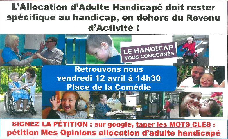 Un rassemblement est prévu le vendredi 12 avril à 14h30 sur la place de la Comédie de Montpellier en réaction aux mesures envisagées par le Gouvernement et prévoyant la fusion de l’allocation adulte handicapé dans la nouvelle allocation de Revenu Universel d’Activité.