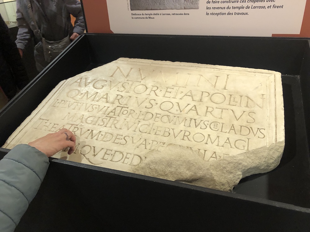 Photo 3 : Copie d’une dalle en marbre, découverte en 1969, qui confirme que Bram n’était pas qu’une station d’arrêt mais une ville importante. Il est écrit que 3 magistrats firent construire un théâtre avec leur propre argent.